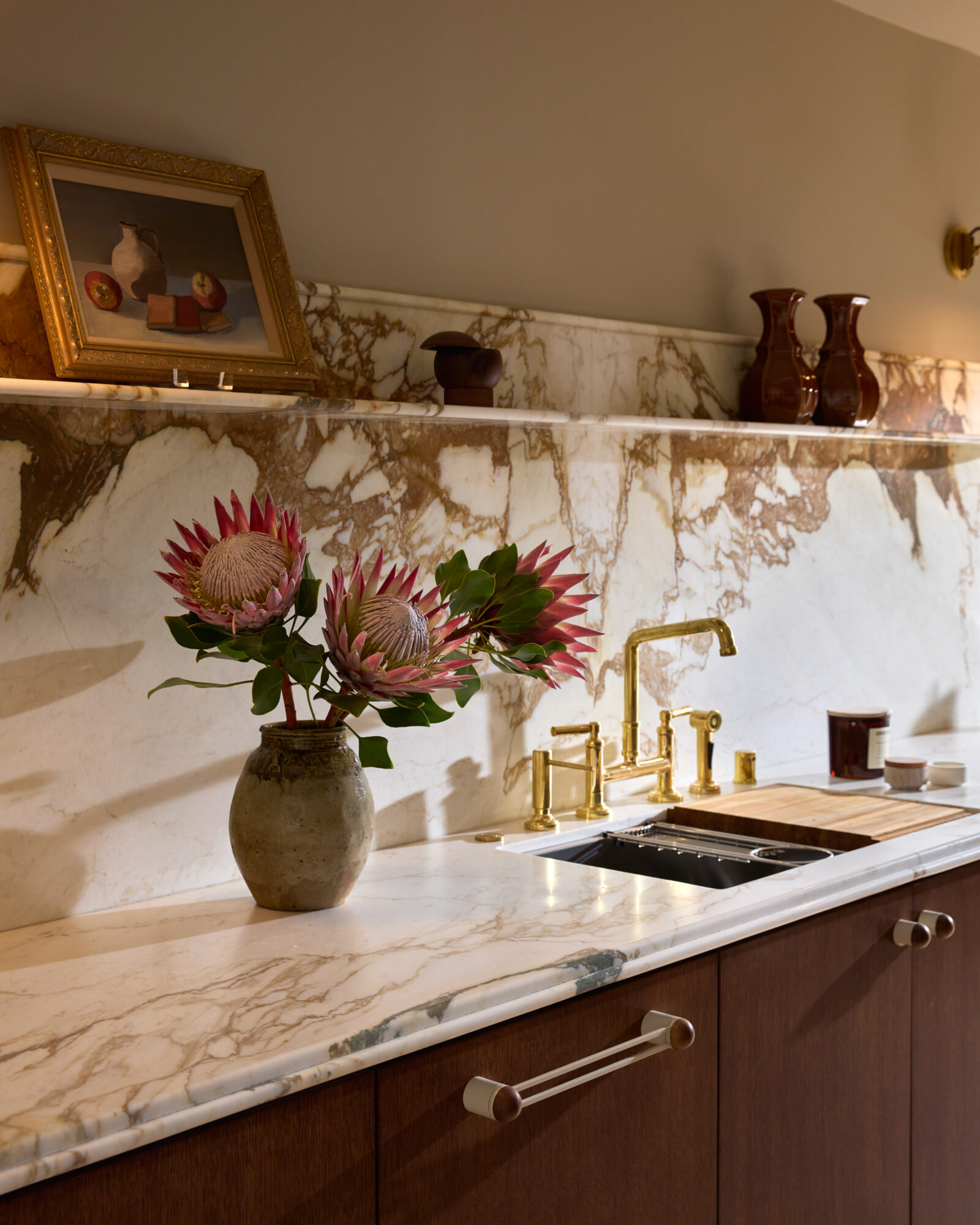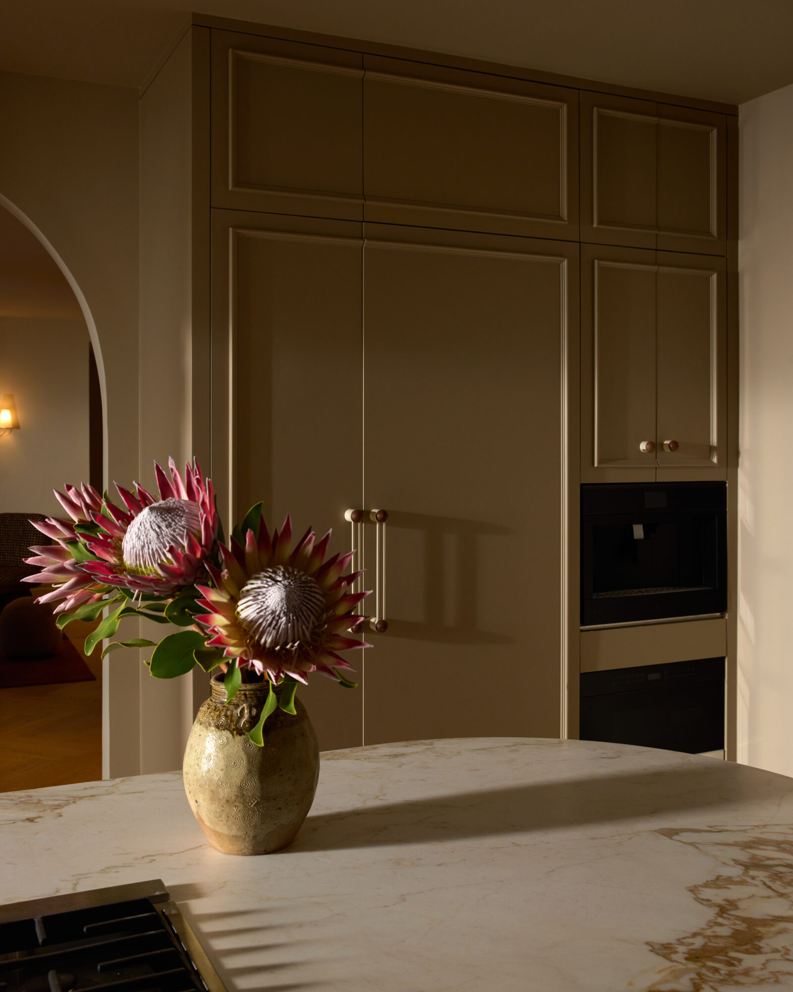 The hardware didn’t take over the project. That was the point. It sat within the material story — nickel picking up the window frames, marble echoing the kitchen stone, walnut connecting back to the floors. On a flip, buyers notice those connections even if they can’t articulate why.