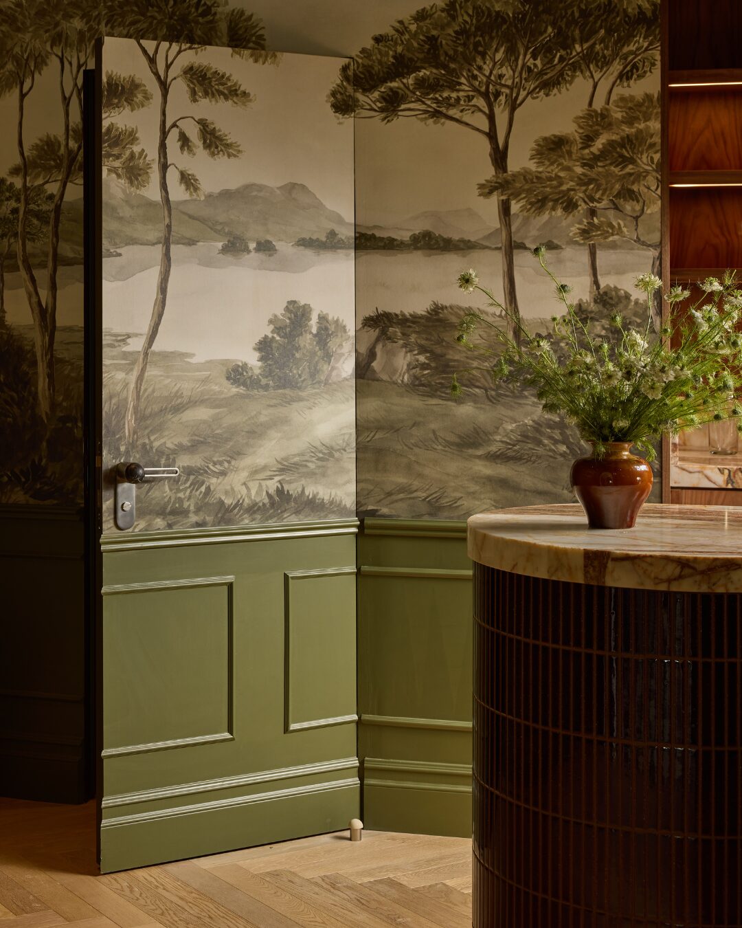The hardware didn’t take over the project. That was the point. It sat within the material story — nickel picking up the window frames, marble echoing the kitchen stone, walnut connecting back to the floors. On a flip, buyers notice those connections even if they can’t articulate why.